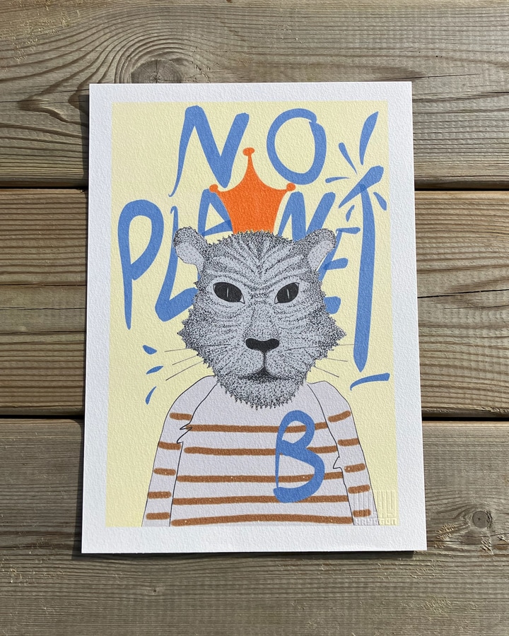 Cette affiche d’un lion, symbole de force et de protection de la nature, pour faire passer son message puissant “No Planet B” baby.