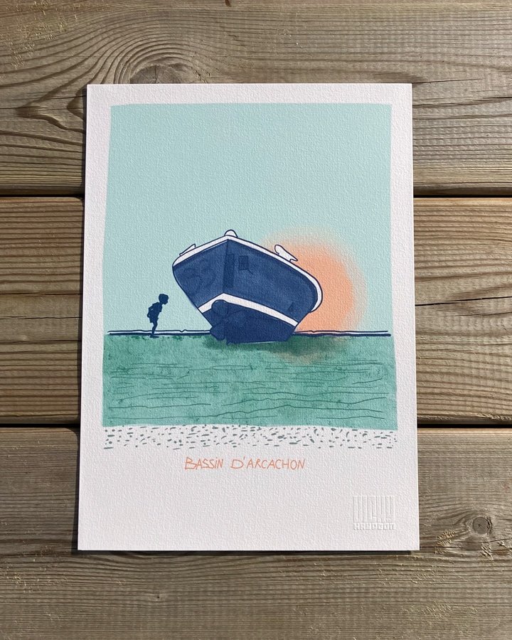 Naviguez dans l’ambiance du Bassin d’Arcachon à bord d’une pinasse ! Cette affiche met à l’honneur le bateau traditionnel du Bassin d’Arcachon.