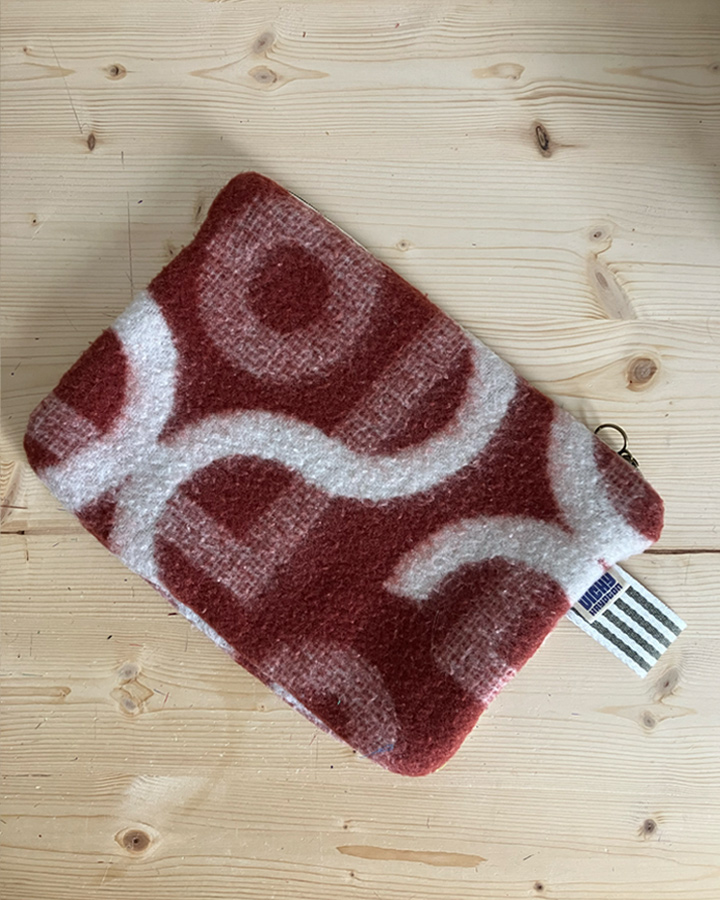 Une pochette upcyclée et unique, sa sangle permet de la porter à la main ou bien la glisser dans son sac !