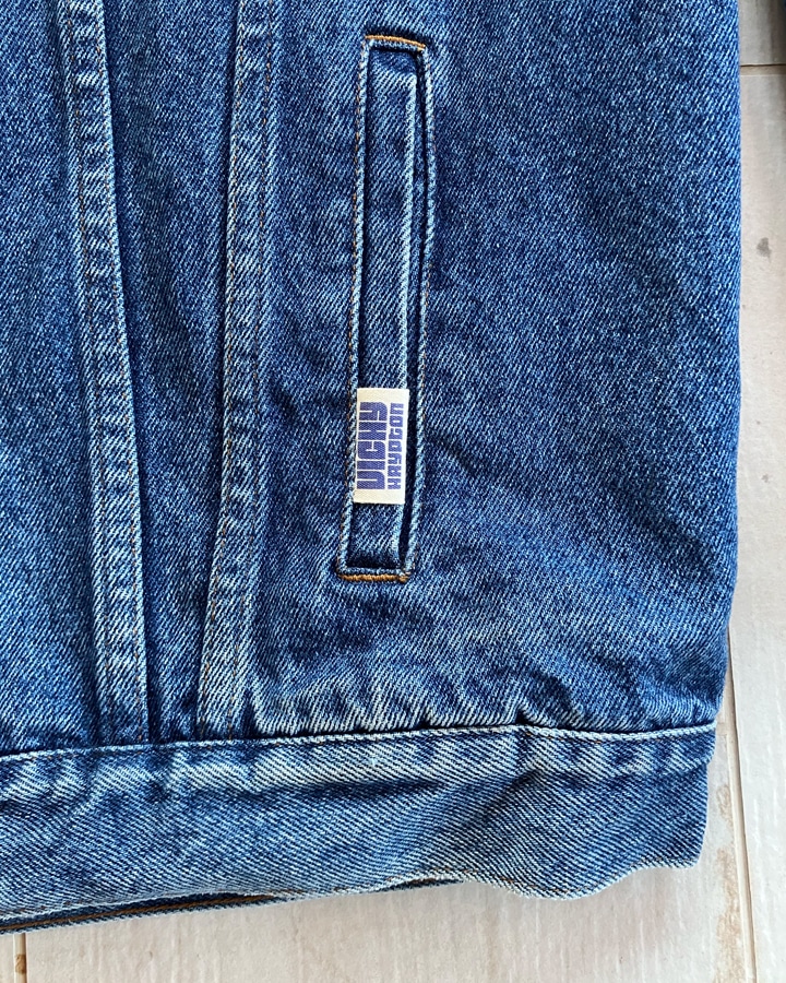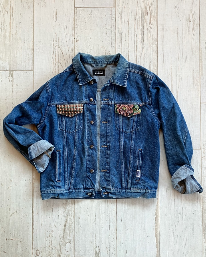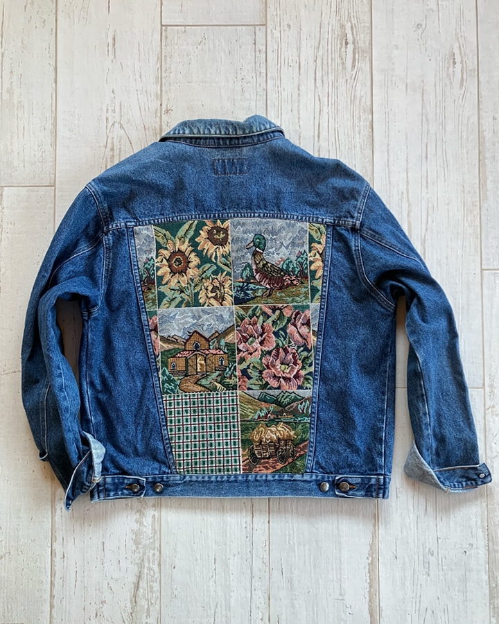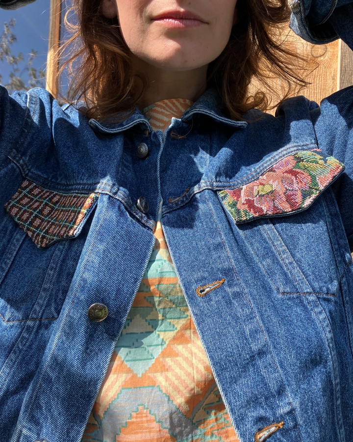 Cette veste est fabriquée à partir d’une ancienne veste en jean que l’on a upcyclé avec un couvre-lit vintage ce qui en fait une pièce unique, unisexe et pleine de caractère.