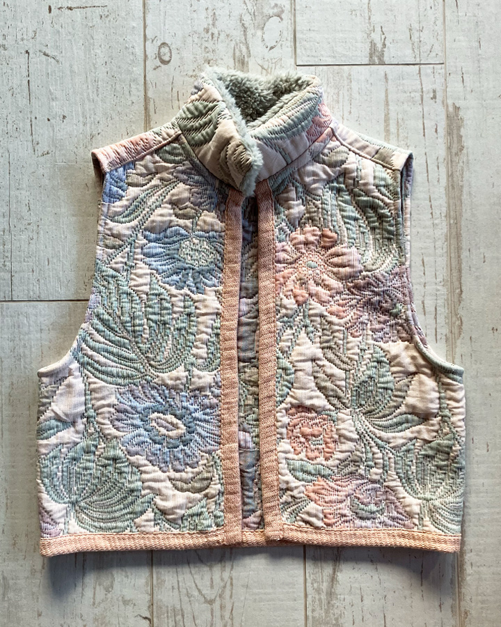 Veste sans manches 100 % upcyclée à col montant et une emmanchure large. Parfaite à superposer sur un gros pull, un sweat, une veste en jean ou même sous un manteau, elle apporte confort et style à toutes vos tenues.
